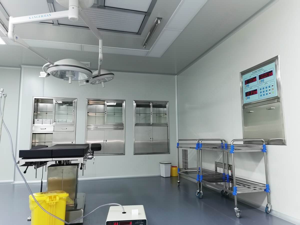 内部采用彩色钢板拼接而成,内部所有拼接缝平整严密.室内设置的显示屏、开关、插座、观片灯、器械柜、药品柜、麻醉柜等均嵌入墙内,不得突出墙面.手术室的内部地面应平整,采用耐磨、防滑、耐腐蚀、易清洗、不易起尘与开裂的材料,抗菌、耐磨的橡胶地面或PVC地材.(具体材质参看报价单)洁净区其它辅助房间、走廊