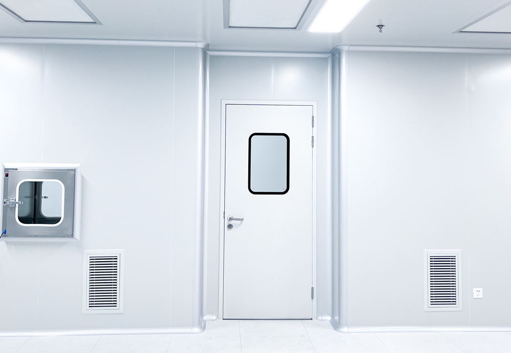 洁净室的门有单开夹芯彩钢板门、双开夹芯彩钢板门和夹芯彩钢板移门。洁净室的夹芯彩钢板门内的夹芯材料通常是岩棉材料。洁净室的夹芯彩钢板密闭门在订购时,其规格、开启方向、门框、门包边、五金件等均按照设计图纸的要求到专门厂家定做,一般可选择厂家的定型产品或由施工单位绘出制作洁净室的彩钢板门根据设计和业主的需要,其门框和门包边材质可用不锈钢、铝合金及铝合金喷塑等。门樘的颜色也可以根据需要定制,但通常与洁净室墙体的颜色一致。
